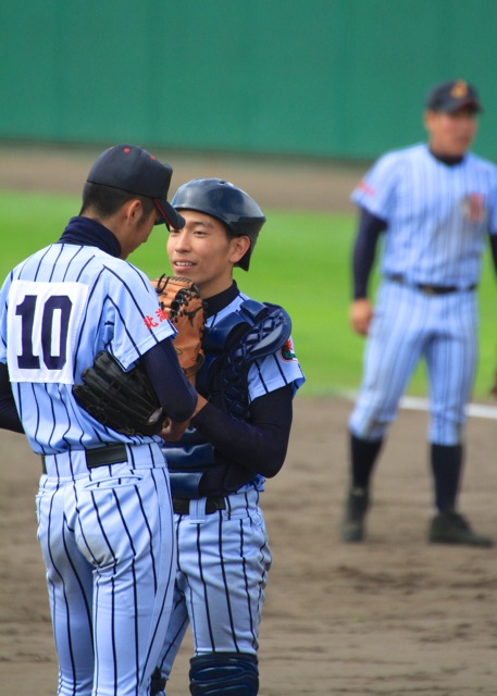1年生投手をリードする花田主将、(9回)笑顔でプレーしやすい雰囲気をつくりあげているようだ。
