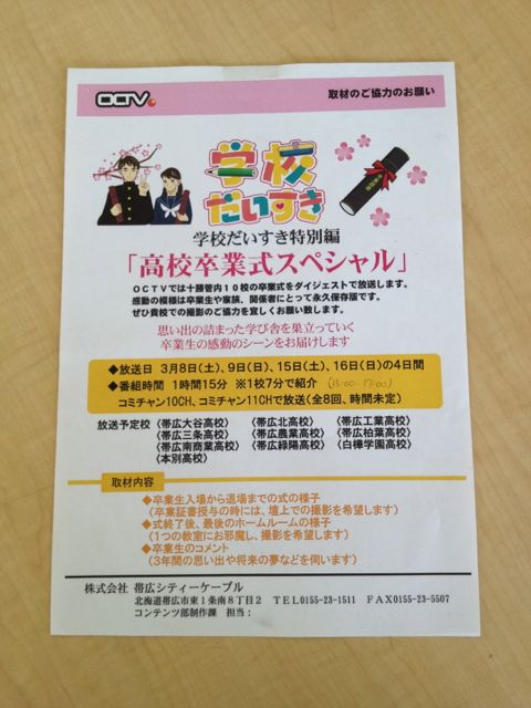 明日白樺学園の卒業式の模様がダイジェストでOCTVで放送されます。帯広のケーブルテレビ局OCTVの人気番組「学校だいすき」の特別編の中で、十勝管内10校の卒業式がダイジェストで放送されます。1校あたりの放送時間は7分で、入退場、最後のホームルームの様子、卒業生のインタビュー等感動のシーンが放送されるという。放送予定校は白樺学園の他に大谷高校、北高校、工業高校、三条高校、農業高校、柏葉高校、南商業高校、緑陽高校、本別高校となっています。放送日は次の通りです。見られる環境の方はぜひご覧下さい。白樺学園の所在地までは・・・残念ながら放送が届いていません。(届かせてください!)なので、私は同僚に録画のお願いをしました。(荘司)