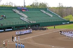 本日8時30分より、帯広の森野球場で第53回春季北海道野球大会十勝支部予選の開会式が行なわれました。昨年度同地区予選より2チーム増え21チーム(22校)の選手達は、球春を告げるような十勝晴れのグランドを帯広柏葉高校生約47名が演奏するブラスバンドの行進曲の中、はつらつとした行進を見せていた。十勝晴れのようなさわやかなユニフォームに身を包んだ白樺学園の代表選手達は、秋よりも 一周り大きく誇らしげに見えた。(荘司)