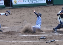 三塁ランナーの木下に続き、二塁ランナーの入江もホームイン