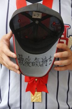 背番号7番、勝負強い打撃の河瀬選手の帽子にはこうかかれていました。