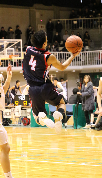 「(離されても)みんな勝負をあきらめずに守って攻撃につなげた。」という主将はスリーポイントシュートを放つ。