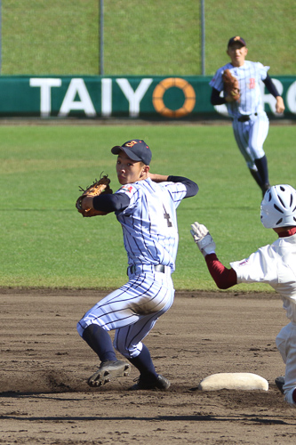 一塁に残ったランナーは、盗塁を試みるが、松山ー業天のバッテリーが刺した。