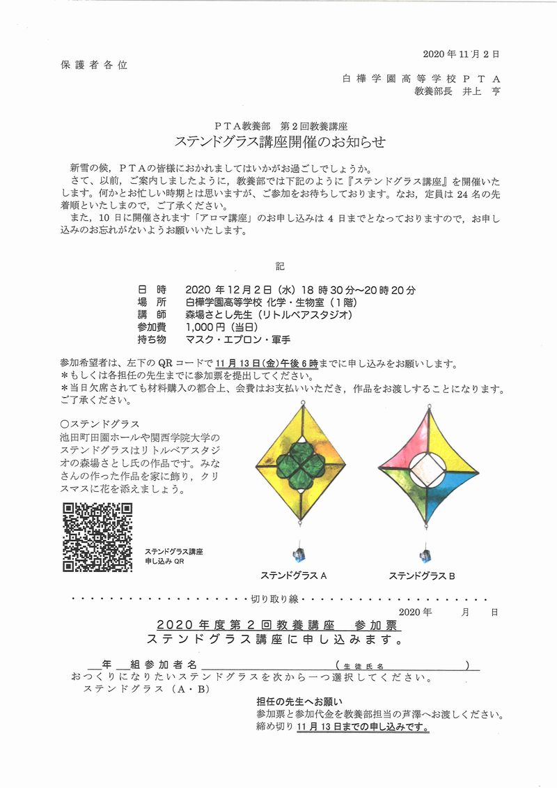 今年度第2回となるPTA教養講座ステンドグラス講座が12月2日水曜日本校化学・生物室で行われます。参加費は千円(当日)で締め切りは11月13日。オンラインでの参加申し込みも可能。本日文書を生徒を通じ配布しました。同じものをこちらにも掲載しますのでご覧ください。(荘司)