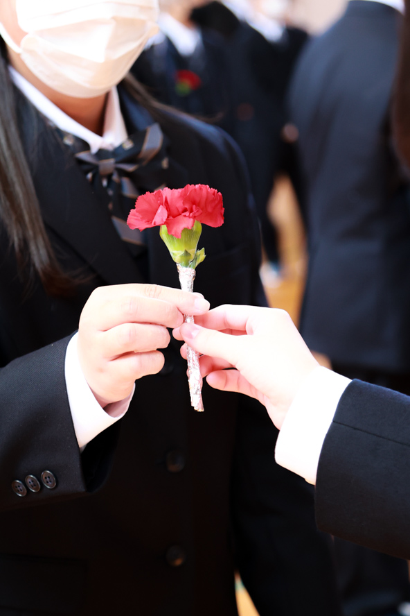 新入生は生徒会から贈られたカーネーションを胸に入場。担任が一人ずつ名前を呼称、校長が入学許可を与えた。新入生代表の村上桂太君(帯広市立帯広第七中学校出身)が、「夢に向かって、勉学や部活動など、精一杯頑張ります。」と宣誓した。