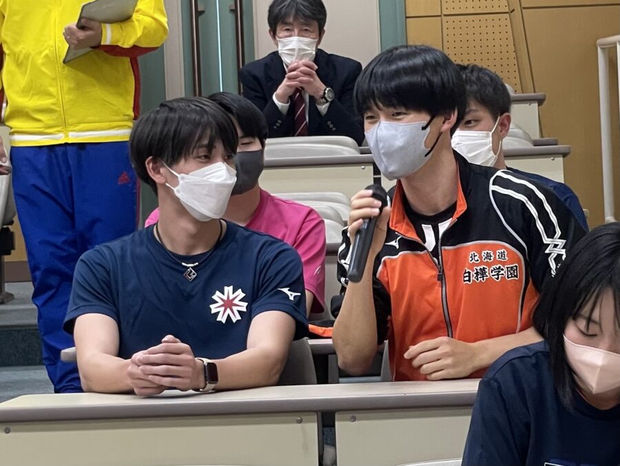 陸上部部長の清水瑛太さんは「安部選手のことは前から知っていたので、講演を聞くのを楽しみにしていました。乳酸の話や、レース前などに集中することなど、共感できることが多かったです。また、スランプはすごい選手であっても経験していて、自分や部員だけではなく誰でも起こり得るものなんだと改めて感じましたし、楽しむことの大切さも改めて理解することができました。」