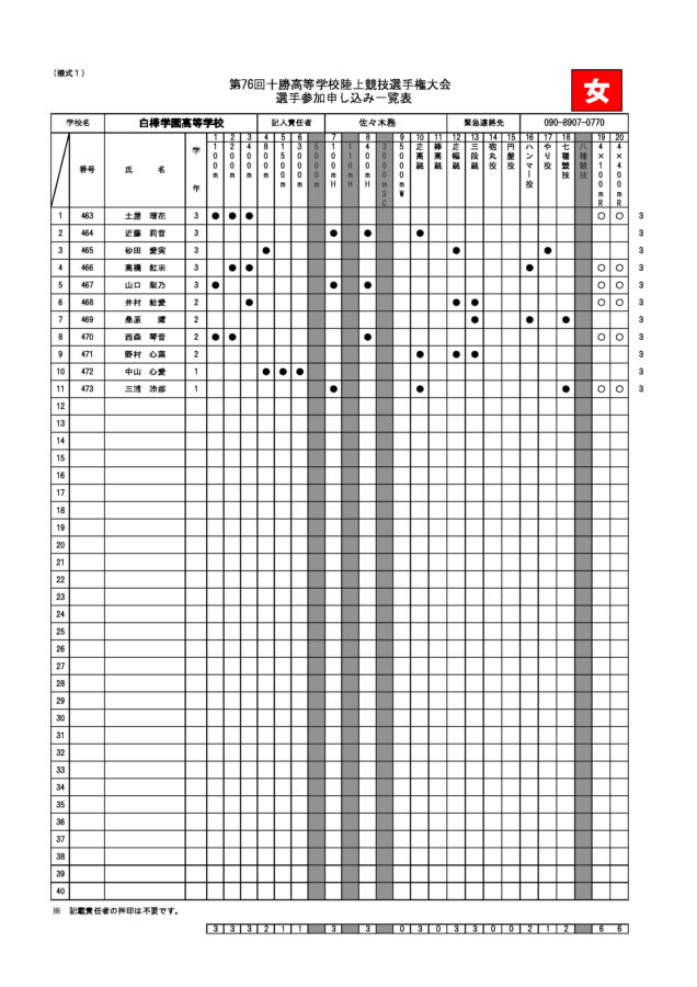 2023年5月16日 新着情報生徒・保護者の皆様へ陸上競技部 【高体連十勝支部大会】 先陣を切って陸上競技がスタート。 5月18日(木)~20日(土)の3日間、帯広の森陸上競技場で高体連十勝支部陸上競技選手権大会が行われます。総合優勝と全道大会出場を目指し、陸上部員の活躍を期待しています。応援を宜しくお願い致します。(湊谷) 【競技日程】 (会場での応援可能です。) 【男子出場競技一覧】 【女子出場競技一覧】 男子スタートリスト 女子スタートリスト
