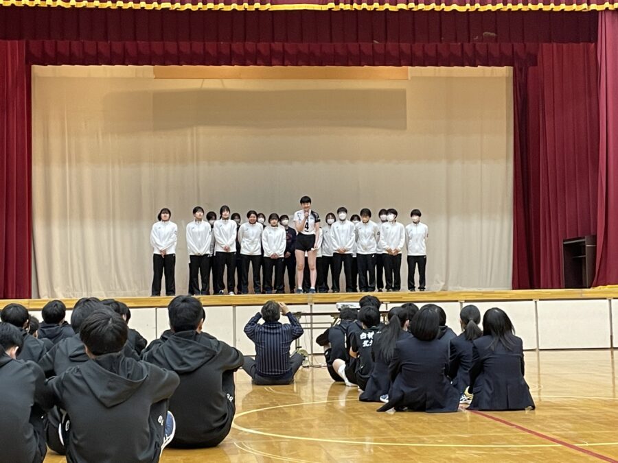 5月16日(火)4時間目、高体連集約大会に参加する部活動、部員に向けた壮行会が第1アリーナで行われました。壮行会では生徒会体育委員長吉田隼都さん(芽室中出身)の激励の言葉。クラス応援動画や教職員応援動画による応援メッセージが送られ、各部の主将より大会への抱負が述べられました。各部、全道大会出場を目指して頑張ってほしいです。応援宜しくお願い致します。(湊谷)