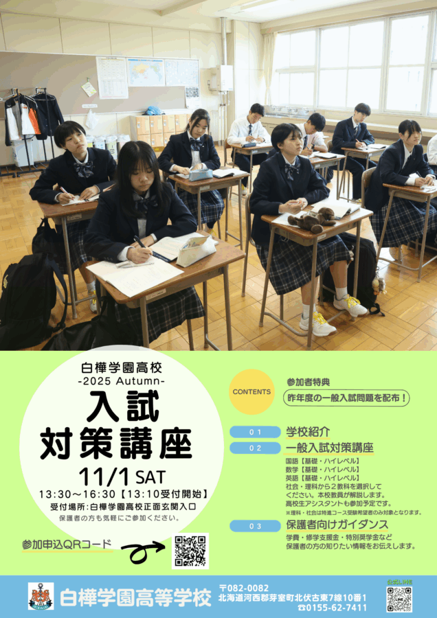 白樺学園高校の過去問題を使って、中学校3年生を対象に白樺学園高校一般入試の筆記試験の入試対策講座を行います。