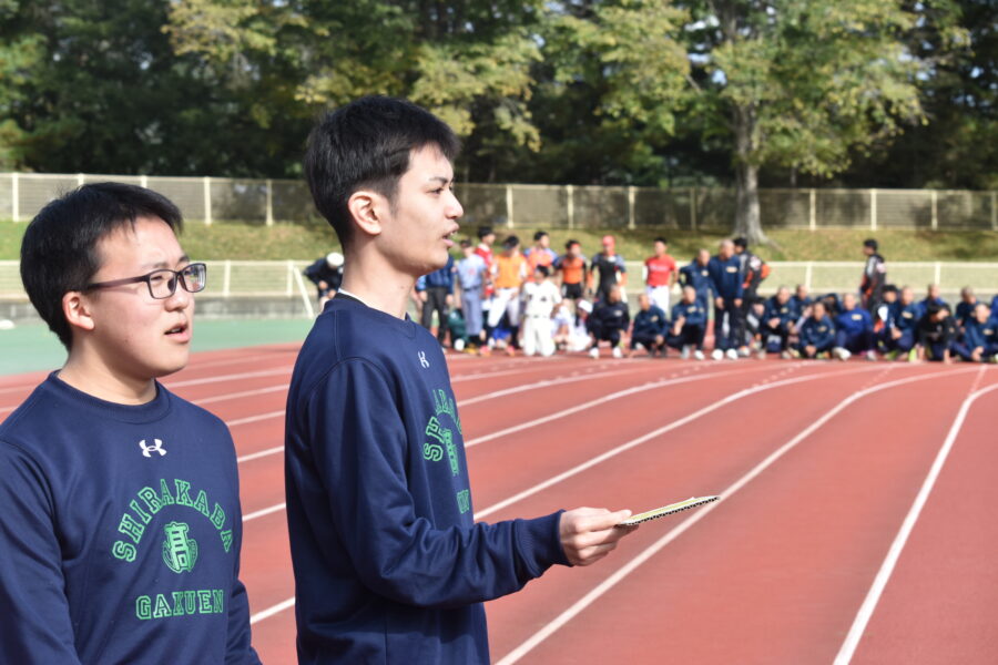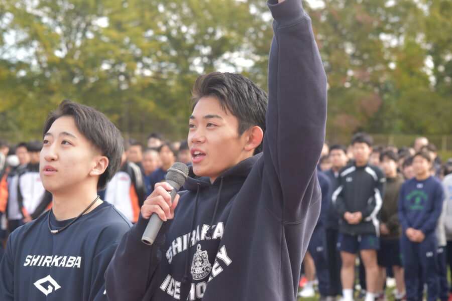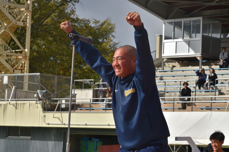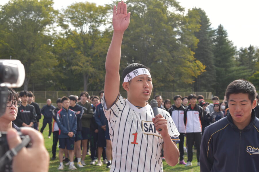 高校時代に応援団だった校長先生からの激励で生徒たちを鼓舞します。