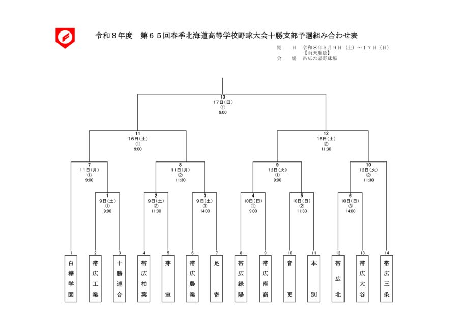 4月28日(火)令和8年度第65回春季北海道高等学校野球大会十勝支部予選の組み合わせ抽選会が15時30分~帯広の森野球場会議室で行われました。その結果、第1シード校である本校の初戦は5月11日(月)9時~帯広工業高校対十勝連合の勝者との対戦となります。応援宜しくお願い致します。(湊谷)