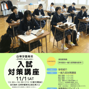 2025年9月29日 オープンスクール新着情報生徒・保護者の皆様へ入学希望の皆様へ進路ご担当の先生へ 11/1(土)入試対策講座を実施します。 11月1日(土)13:30~本校にて入試対策講座を実施します。 白樺学園高校の過去問題を使って、中学校3年生を対象に白樺学園高校一般入試の筆記試験の入試対策講座を行います。 対策講座は国語【基礎・ハイレベル】・数学【基礎 […]
